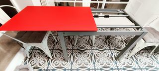 Mesa de cocina con superficie de cristal y estructura de metal. - Diseño moderno y funcional. - Acabado en color rojo y gris. - Medidas extendida 150x60cm