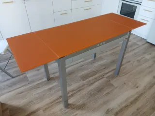 Mesa de cocina con cajón de cubiertos incorporado. - Encimera de cristal en color naranja. - Estructura y patas de metal en color gris. - Extensible en dos tramos diferentes por ambos extremos. - Medidas: largo 1 mt. (extensible a 1,30 mt y 1,60 mt), ancho 0,60 mt, alto 0,78 mt.