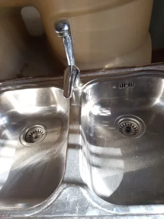 Fregadero de cocina de acero inoxidable con dos cubetas y grifo. - Doble seno. - Incluye grifo. - Encimera de apoyo.