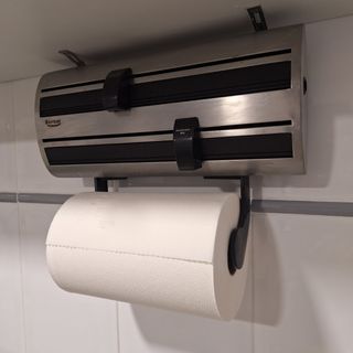 Porta rollos de cocina, para papel, film y papel de aluminio. Acero inoxidable. Se puede atornillar a la pared o bajo de los muebles de la cocina.