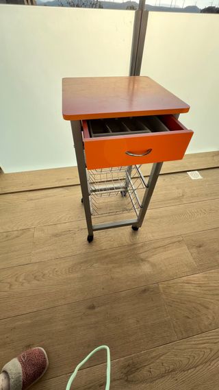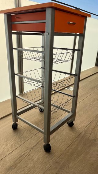 Carrito auxiliar con superficie de baldosas y estructura de madera. Encima lleva baldosines para las cocinas pequeñas puedes utilizar la para comer lleva ruedas de freno no - Baldas metálicas. - Ruedas para fácil movilidad.