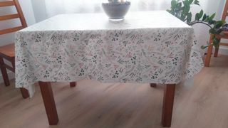 Mesa de cocina con un bonito estampado floral en tonos tierra y verde. Sus patas son de madera de pino. - Medidas: 70 x 100 cm. - Diseño de mantel con motivos botánicos.