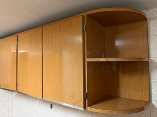 Conjunto de armarios de cocina con un diseño moderno y funcional. - Acabado en madera clara. - Tiradores metálicos integrados. - Diseño de tres puertas superiores. El primer armario mide 85cm de ancho y el segundo 35cm. Ambos 34cm de profundo y 70cm de altura.