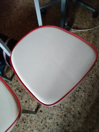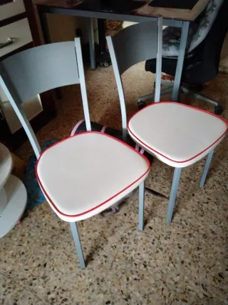 Conjunto de dos sillas de cocina con un diseño moderno y funcional. - Asientos blancos redondos. - Patas y estructura de metal cromado. - El acero está bien,en algun trozo de la madera de los asientos de ha ido la pintura, como se aprecia en las fotos. De ahí el precio. La estructura es muy fuerte. Si solo quieres una 10 euros y si te llevas las dos te las dejo en 15 euros
