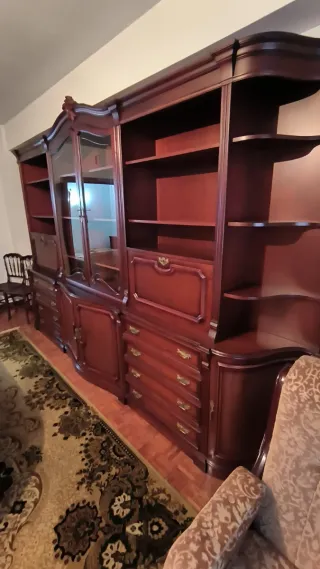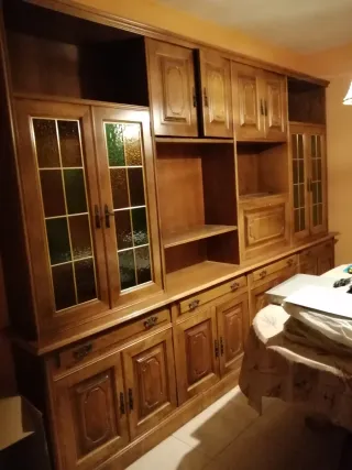 Mueble de madera con vitrina, color caoba, con detalles en cristal, ideal para comedor o salón. En perfecto estado, puesto que se reformó una pequeña sala de estar y no sé llegó a usar el salón. Ayudamos a desmontar y cargar el mueble. - Amplio espacio de almacenamiento. - Puertas con tiradores dorados. - Estantes interiores.