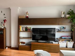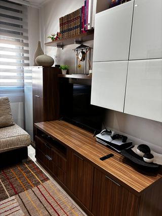 MUEBLE DE TV DE SALÓN – MUY ROBUSTO 180 € Mueble de TV de salón en acabado madera, muy robusto y funcional de gran calidad. Necesita algunos frontales. Incluye módulo bajo para TV, estanterías laterales y módulos superiores, con gran capacidad de almacenaje A tener en cuenta: Algunos frontales presentan desgaste por el sol. Se soluciona fácilmente cambiando algunas tapetas frontales.