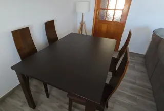 Conjunto de mesa de comedor con cuatro sillas. Comprado hace 3 meses, totalmente nueva. Disponible para recoger a partir del 1 de marzo. - Mesa de madera. - 4 Sillas de madera a juego.