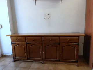 Mueble de madera con acabado en cerezo, ideal para comedor o recibidor. Sus puertas dobles ofrecen un buen espacio de almacenamiento. - Dimensiones 136x43x81 cm (largoxprofundoxalto) - Esta compuesto por dos módulos unidos y con un sobre que cubre los dos modulos. - Diseño elegante y funcional, perfecto para separacion de ambientes en comedor o situarlo en un recibidor. - Acabado en tono cerezo. No realizamos envios ni transporte. Recogida en Badalona