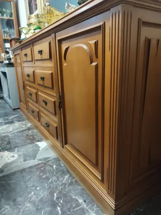 Mueble aparador de comedor con un diseño clásico y elegante. - Acabado en madera de tono cálido. - Múltiples cajones y puertas para almacenamiento. - Detalles ornamentales en los frentes.