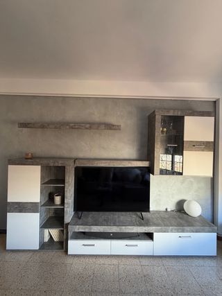 Conjunto de mueble de comedor en tonos gris y blanco. Incluye estanterías y módulos de almacenaje. Se vende por mudanza, mueble muy bien cuidado, tiene 1 año. - Diseño moderno. - Combinación de acabados. - Ideal para salones actuales. Transporte a cargo del comprador.