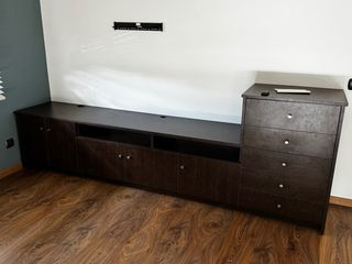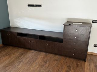 Conjunto de muebles de madera para salón comedor. - Acabado en color marrón. - Detalles en cristal. Incluye los cajones que faltan del mueble de la tele