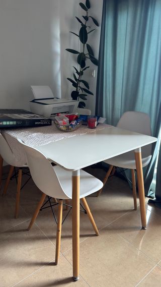 Vendo mesa de comedor con las 4 sillas un diseño moderno y elegante. Algunas marcas de uso (ultimas fotos). - Patas de madera. - Tablero de plástico.