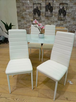 Elegante conjunto de mesa y 4 sillas de comedor, La mesa es de cristal templado la cual garantiza capacidad de resistencia, además de un elegante diseño. Su set de 4 sillas están estructuradas por tapizado polipiel acolchado y estructura metálica - Medidas: 110x70cm - Colores: negro, blanco, gris - Envio adomicilio (consulta tarifa) - Pago contra rembolso