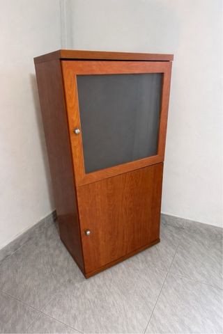 ** SE HACEN ENVIOS ** 2 armarios auxiliares de madera con puerta de cristal. Los 2 son iguales en la parte superior, pero diferentes en la parte inferior: 1 tiene 3 cajones y el otro tiene una puerta. - Diseño compacto ideal para espacios reducidos. - Acabado en madera de cerezo. - Puerta superior con panel de cristal. - Tiradores metálicos.