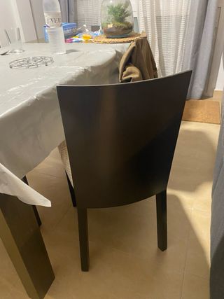 Elegante mesa de comedor con un diseño moderno. - Acabado brillante. - Base geométrica. - Patas metálicas. Tiene algunas picaduras. Vendo sillas a parte si interesa, 6 x 180€.