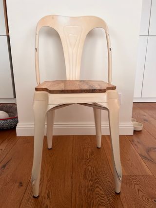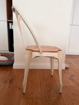 Silla con un diseño moderno y versátil, perfecta para comedor o habitación. - Asiento de madera con acabado natural. - Estructura metálica en tono beige.