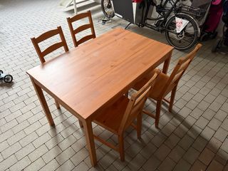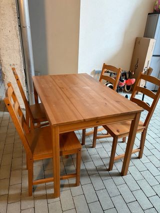 Ikea. Conjunto de mesa de comedor con cuatro sillas a juego, con un acabado que imita la madera. - Mesa de madera. - Incluye 4 sillas de madera. Recoger en Roquetes, Barcelona.
