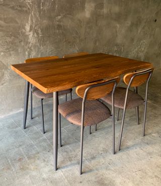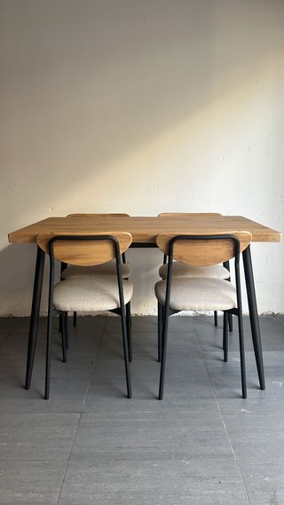 Conjunto de mesa y 4 sillas totalmente nuevo, sin usar. Viene en su CAJA A ESTRENAR, ideal para quien quiera estrenar muebles modernos y de calidad. La mesa está hecha en madera maciza con un acabado elegante y natural, combinada con patas metálicas que aportan estabilidad y un estilo contemporáneo. Las sillas incluyen asiento acolchado, respaldo de madera y estructura metálica a juego.
