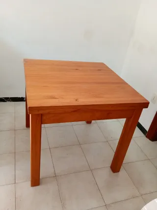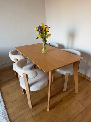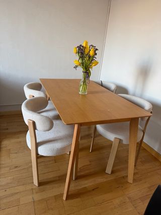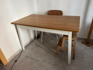 *LAS SILLAS NO SE VENDEN* Mesa de comedor de madera maciza con un diseño moderno y elegante. Sus dimensiones son 140x80 cm, ideal para reuniones familiares o con amigos. - Patas de madera robustas. - Tablero liso y fácil de limpiar. Tiene un pequeño desperfecto de 1cm, simplemente se le ha ido un poco el barniz (se ve en las fotos)
