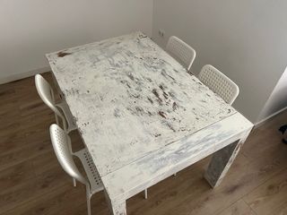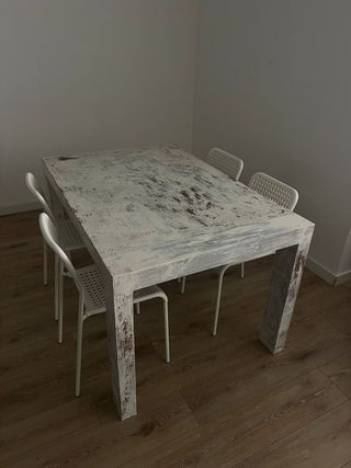 Conjunto de mesa de comedor con cuatro sillas. - Mesa con acabado rústico en madera y blanco. Tiene el color desgastado pero la estructura está en perfecto estado - Sillas de plástico blanco con diseño moderno.