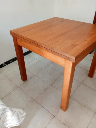 Elegante mesa de comedor con un diseño clásico y acabado brillante. - Patas robustas para mayor estabilidad. - Tablero con incrustaciones de madera en patrón geométrico. -tiene dos alas extensibles de 58 cm cada una osea que puede medir hasta 2,66 cm. -Esta muy bien conservada pero tiene reparadas y reforzadas las patas (ver foto) -Hay cuatro sillas a juego