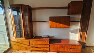 Conjunto de muebles de comedor que incluye vitrina, mueble de TV y mesa. - Mueble de TV con estantes y cajones. 260 cm ancho x 215cm de alto x 40 de profundidad. - Vitrina con puertas de cristal. - Mesa de comedor a juego de madera. 90x90xm ( abierta 180cm) Tiene algún desperfecto como se puede ver en las fotos. Hay que venir a desmontarlo y recogerlo. No hago envíos.