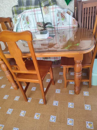 Elegante mesa de comedor de madera maciza. Las sillas son con dibujos labra y también de madera maciza y realmente nuevas sin arañones y sin ningún defecto. También incluye tapa de cristal como protector. No se ha usado prácticamente nada. -Medidas: 1,40cm x 80cm