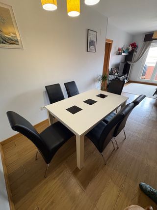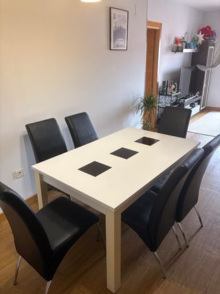 Conjunto de mesa de comedor extensible y seis sillas a juego, fabricadas en madera. Recoger personalmente.