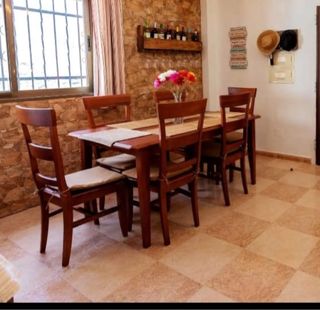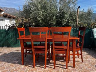 Muy bonita! Conjunto de mesa de comedor de madera con cinco sillas a juego. Ideal para crear un espacio acogedor. De la marca “Irene Ramirez” 160cm de largo y 90cm de ancho. En buen estado salvo algun pequeño toque por uso normal.