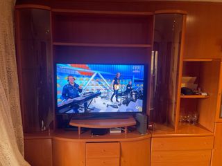 Mueble comedor con una combinación de materiales que le dan un toque moderno. Mueble de comedor muy amplio y elegante. El que lo quiera se tiene que encargar de desmontar y llevarselo La televisión en principio no está incluida. Precio 100