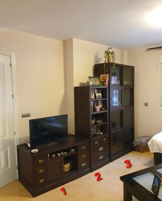 Pack de muebles para el salón. Posibilidad de comprarlos todos juntos o por separado!! El pack incluye: 1. Mesa de TV madera ( 250 euros) 2. Estantería salón madera ( 250 euros) 3. Vitrina madera salón (300 euros) 4. Mesa baja madera salón (250 euros) 5. Mesa comedor madera salón (400 euros) 6. Vitrina baja de madera (350 euros) 7. Estantes para libros madera (150 euros) Precio del total= 1.500 euros