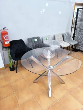Elegante mesa de comedor con sobre de cristal y base de metal. - Diseño moderno y minimalista. - Patas cromadas en forma de S. - Tablero de cristal templado. Regalo las cuatro sillas,estan algo peladas pero el armazon esta impecable