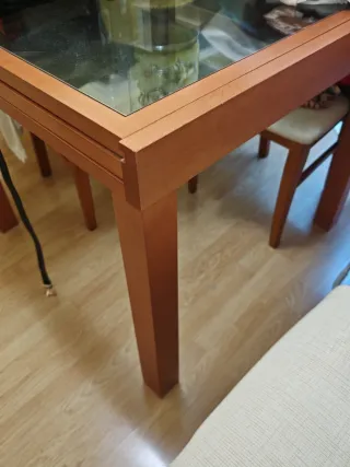 Elegante mesa de comedor extensible con una combinación de madera y cristal. Precio negociable medidas: 130 cm largo plegada 220 cm largo extendida 83 cm ancho 75 cm Alto - Diseño moderno y funcional. - Acabado en madera natural. - Superficie de cristal transparente.