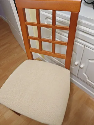 Conjunto de sillas de comedor con un diseño moderno y elegante.Con algun mini enganchón apreciable en última foto. - Estructura de madera en tono natural. - Asiento tapizado en tela color beige. -Son tres una 15 euros.las tres por 30