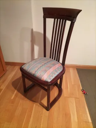 Conjunto de seis sillas de comedor con un diseño elegante. - Estructura de madera robusta. - Tapicería de tela con estampado multicolor. - Respaldo con listones verticales.