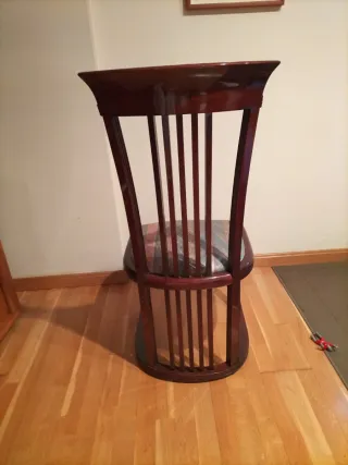 Conjunto de mesa de comedor extensible con seis sillas a juego. El diseño es clásico y elegante, ideal para cualquier hogar. - Mesa de comer ovalada en madera de cerezo, con acabado pulido y tinte rojizo. (100€) - Con patas torneadas y una base central sólida. - Mesa extensible para maximizar el espacio y la versatilidad. - Seis sillas de madera a juego con la mesa, con asientos tapizados en color naranja. (20 €/ud) El conjunto completo de mesa y 6 sillas 195 €