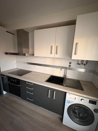 Conjunto de muebles de cocina de segunda mano en color gris lacado satinado y blanco mate. 270 cm de encimera Pack de muebles de cocina, módulos de 60cm y especiero de 30cm Muebles altos y bajos, almacenaje, cajones, etc. Electrodomonesticos como horno, lavadora y campana van a parte. Placa vitrocerámica no disponible. Incluyo encimera, fregador antracita y grifería. Madera en perfecto estado, no tiene ningún desperfecto de humedad