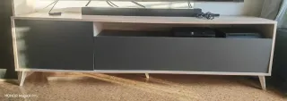Mueble de TV de diseño moderno con acabado en madera clara y puertas en color gris. - Patas cónicas de madera. - Compartimento central abierto. - Puertas con tirador oculto. Medidas mueble TV: Alto 51cm Ancho 180cm Fondo 41cm Mueble colgado: Alto 35cm Ancho 180cm Fondo 30cm El mueble de la TV está en buen estado, tiene 2 marcas en la parte izquierda. La parte de arriba se regala ya que necesita de un cambio de los tornillos que sujetan las escuadras si se quiere colgar. Se puede vender junto al aparador que está en otro anuncio.