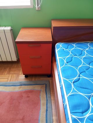 Habitación completa de madera maciza. Cama nido+ colchón+ arcón+mesilla con ruedas+escritorio+vitrina+3 estanterías. Regalo alfombra. - Cama nido+ colchones+ arcón 1,90 x 90 cm - Mesilla con ruedas largo 0,40 cm ancho 0,40 cm alto 0,60 cm - Escritorio largo 1,50 cm ancho 0,50 cm alto 0,72 cm - Vitrina largo 1,40 cm ancho 0,60 cm fondo 0,40 cm - Estantería naranja ( encima de la cama) largo 1,10 cm fondo 0,28 cm -Estanteria largo 1,10 cm fondo 0,28 cm - Estantería largo 1 m fondo 0,28 cm