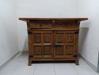Mueble de madera con un diseño único y detalles tallados. - Puertas con relieves geométricos. - Figuras talladas en las puertas laterales. - Tiradores dorados. Leve marca en parte superior resto en perfecto estado a recoger en Burgos a cargo de comprador
