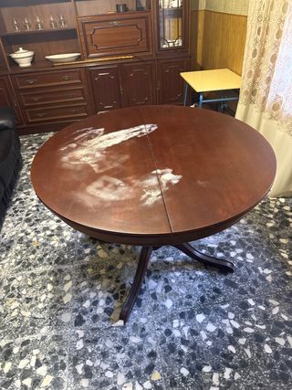 Mesa redonda de madera con un diseño clásico. Presenta algunas marcas de lejía en la superficie. - Material: Madera. - Color: Marrón y blanco.