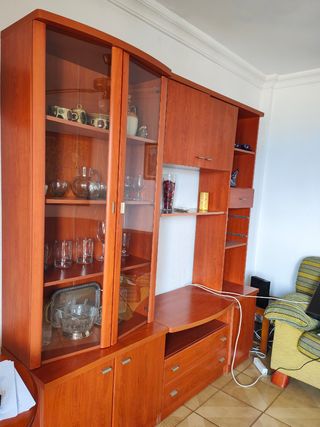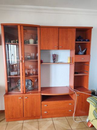 Conjunto de muebles de salón modular, mide 2,83 ancho total, el módulo más alto mide 60x43 x2,10de, el de la tele 100,50x 63 y el de la derecha. 120 x 43 y de alto 1,44, ( son dos módulos juntos como se aprecia en la foto), el mueble tiene gran capacidad y es de buena calidad - Mesa de madera de 90x90 a conjunto con el mueble, se abre como un libro y mide 180 abierta, muy fácil de abrir y cerrar - Sillas a juego