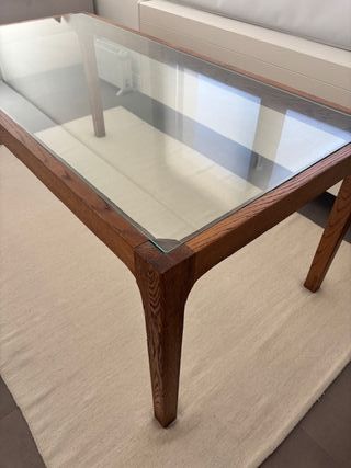 Elegante mesa de centro con estructura de madera de olmo y tapa de cristal. - Diseño moderno y funcional. - Patas de madera robustas.