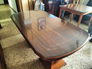 Elegante mesa de comedor con base de madera y superficie de cristal. - Diseño clásico y robusto. - Patas de madera tallada con detalle. - Tablero de cristal transparente.
