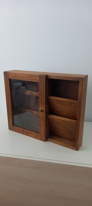 Práctico mueble de madera con compartimentos para llaves y cartas. Cuenta con una puerta de cristal para ver el interior. - Diseño de madera con acabado marrón. - Puerta con cristal transparente. - Compartimentos para organización.