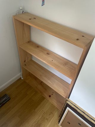Estantería de madera con un diseño sencillo y funcional. - Cuatro baldas para almacenamiento. - Ideal para organizar libros, objetos decorativos o cualquier pertenencia. - Construcción robusta.