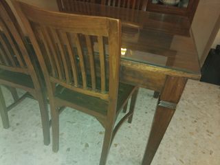 Conjunto de mesa con superficie de cristal y cuatro sillas de madera. - Mesa con sobre de cristal. - Estructura de las sillas en madera.
