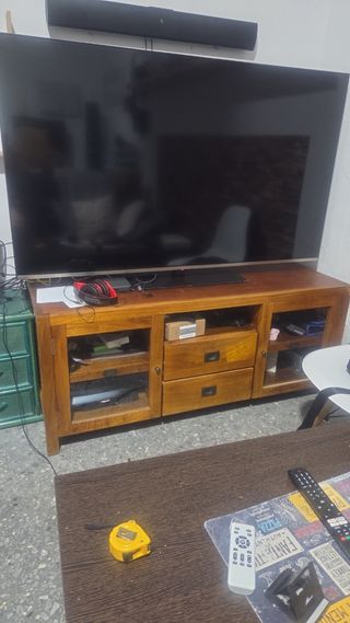 Mueble de salón con un diseño moderno y funcional. - Estructura principal de madera maziza. - Puertas y estantes con detalles de cristal. Dos puertas abatibles y dos cajones. Medidas 140ctm largo 55ctm ancho y 60ctm de alto Se puede ver sin compromiso.