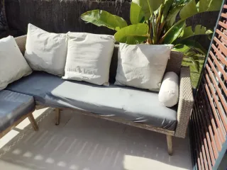 Sofá esquinero de exterior, para Jardin o terraza. - Estructura de ratan y madera, en buen estado, sin ninguna rotura en el ratan. - Cojines de tela en color gris, algunas fundas estan deterioradas y seria mejor cambiarlas. El relleno se puede aprovechar.