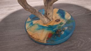 Mesa de centro con un diseño único que combina madera y resina. - Superficie con acabado brillante y veteado. - Base de madera con detalles en resina azul y tonos tierra. - Patas de madera natural que aportan un toque orgánico.